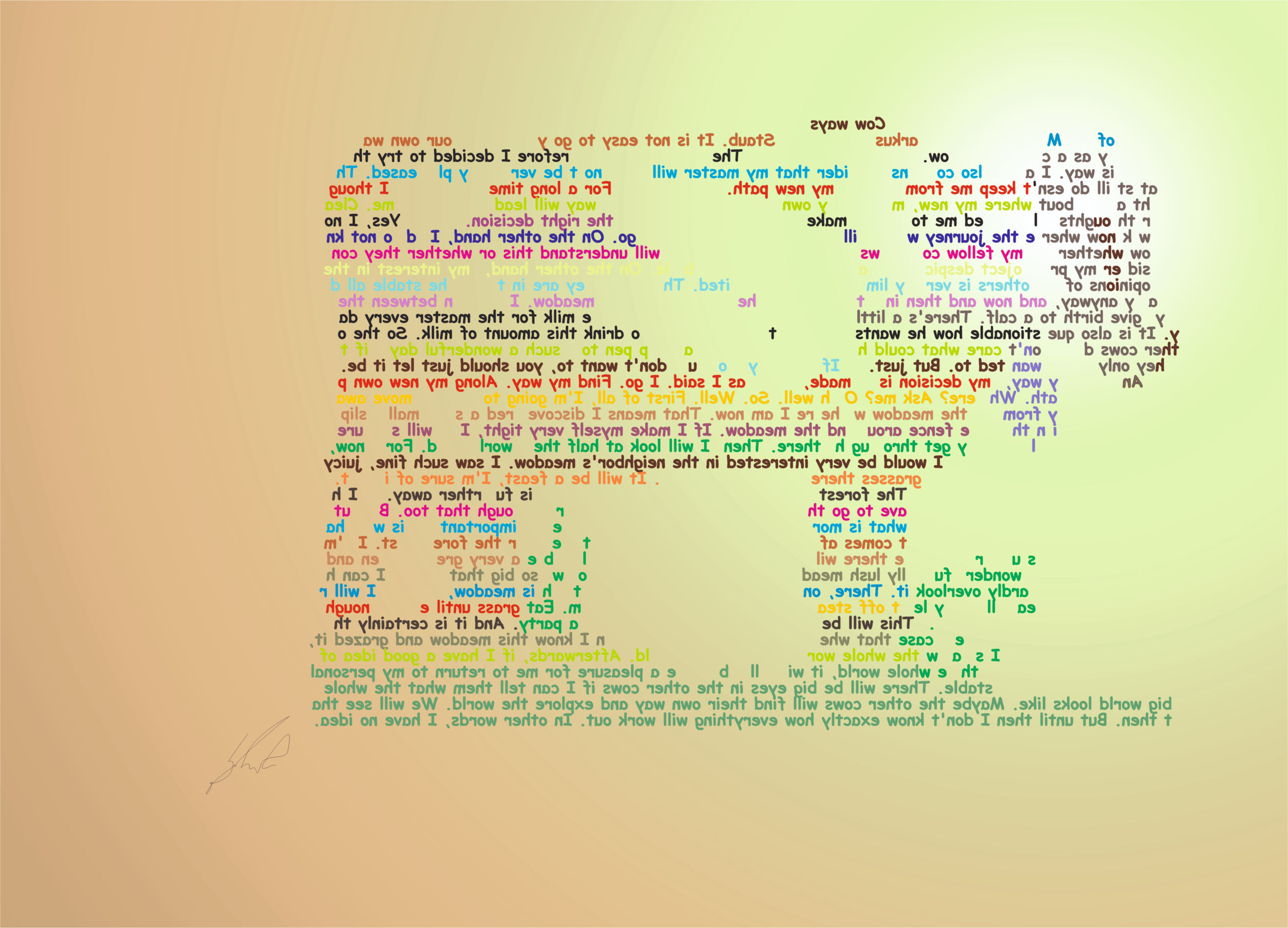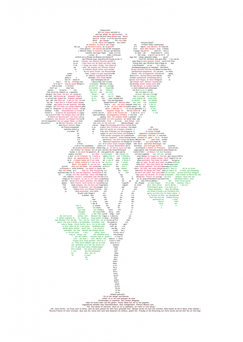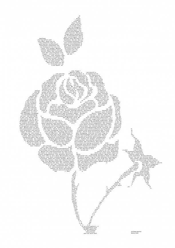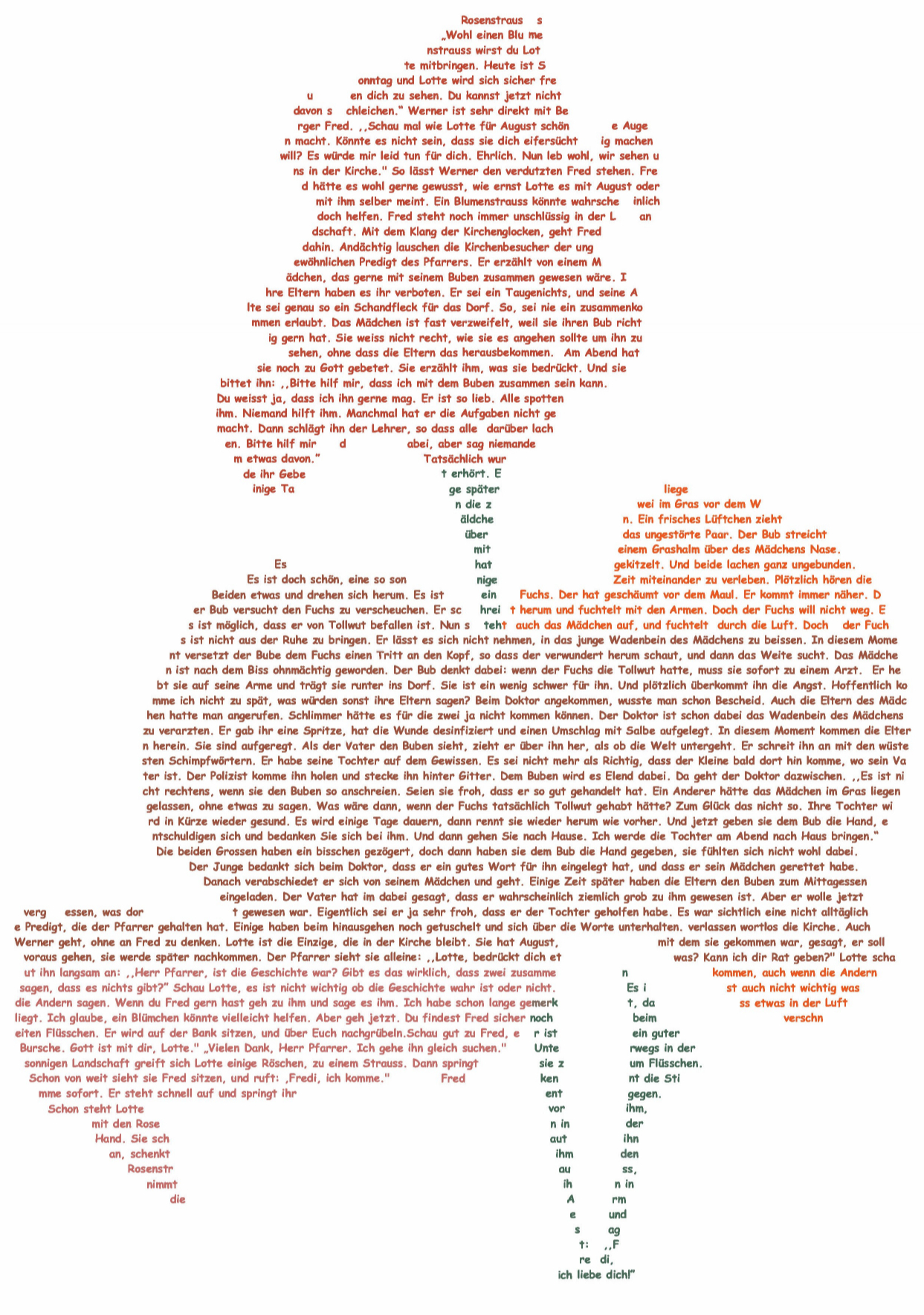 Diese Wörter werden in der natürlichen Reihenfolge angeordnet, dass die geneigte Leserschaft das Wort-Bild Zeile für Zeile von oben bis unten wie in einem Buch lesen kann. Dabei kann es vorkommen, dass Wörter auseinander gerissen werden. Doch dies ist nur ein Klecks. Und mit ein wenig Konzentration lesen sich diese Worte wieder ganz zusammen.